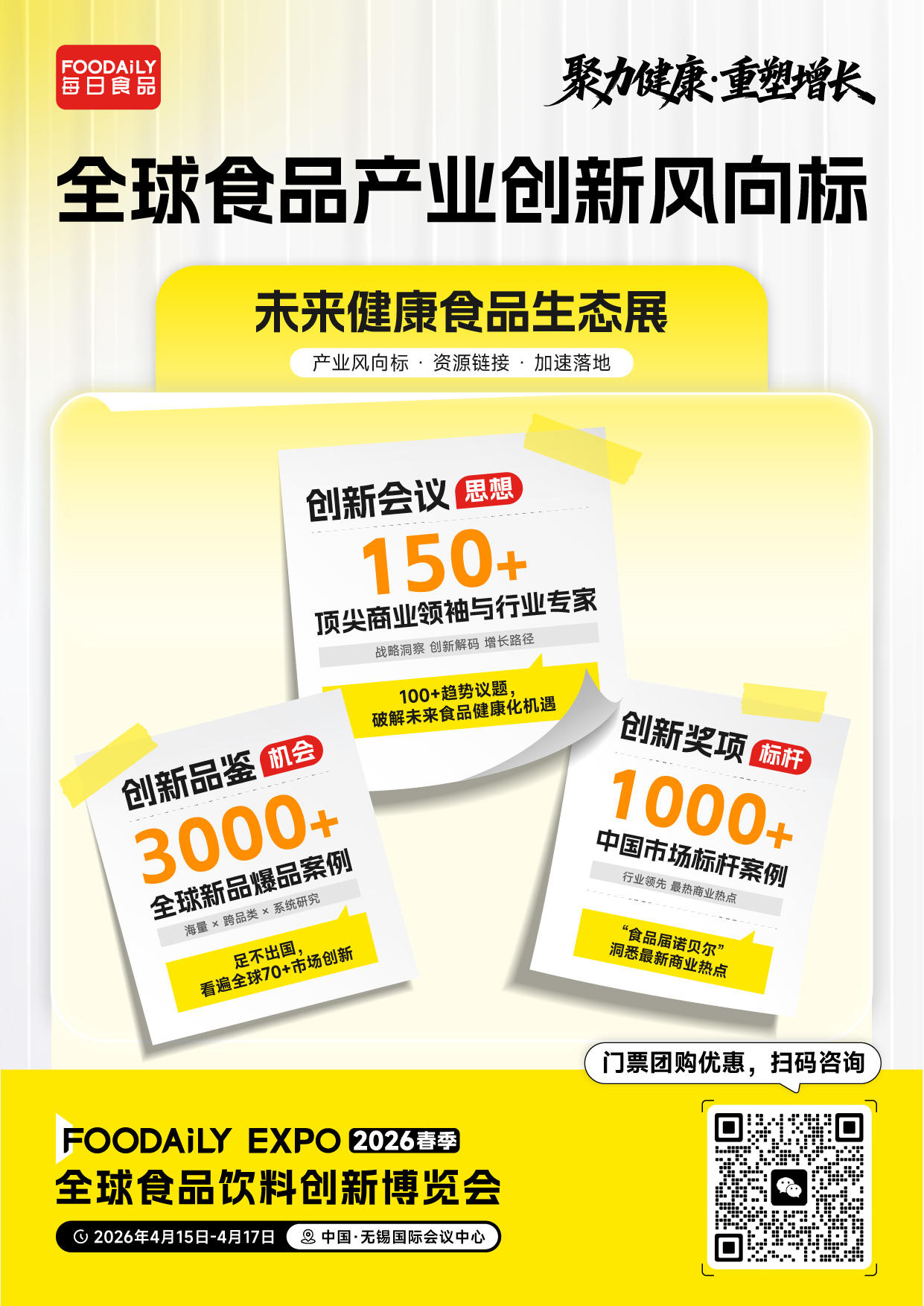 2026年4月15-4月17日,2026 Foodaily全球食品创新博览会将于中国·无锡国际会议中心盛大召开!我们将锁定「聚力健康 · 重塑增长」的核心主题,汇聚全球力量,厘清健康化发展脉络,启发创新解法、链接优质资源,以共识凝聚动能,重构未来十年食品产业增长逻辑!